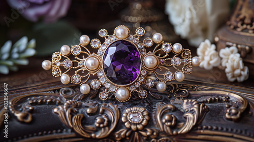 Obraz premium A regal Victorian brooch adorned with amethyst stones and pearl accents,...