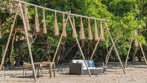 Fototapeta premium A relaxation area on a tropical beach. Wicker plastic furniture: tables, chairs, a sofa with soft cushions stand on the sand. Decorative tassels are suspended on bamboo poles. Lush green vegetation.