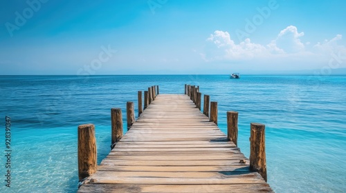 Obraz premium A relaxing sea view with blue waters and a wooden pier stretching out into...