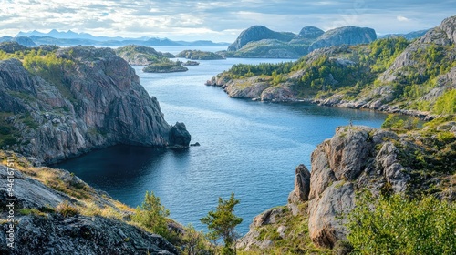 Fototapeta premium A remote archipelago with rugged cliffs and hidden coves, surrounded by the deep blue ocean.