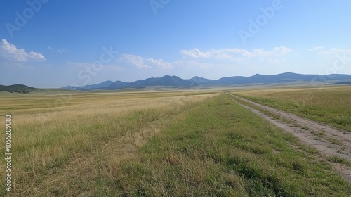 Fototapeta premium A remote road cutting through a grassy plain, with distant mountains visible...