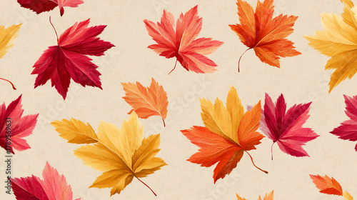 © Shahazadi, Fototapeta premium A repeating pattern of colorful autumn leaves in shades of red orange and yellow colors