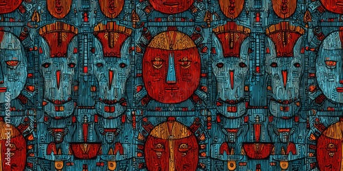 Obraz premium A repeating pattern of stylized faces, featuring intricate details and vibrant colors, creating a captivating and symbolic design.
