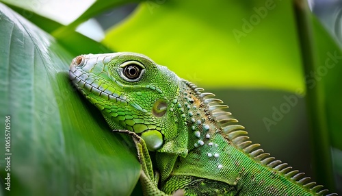 Naklejka premium A reptilian green iguana basks in the sun on a tropical tree branch