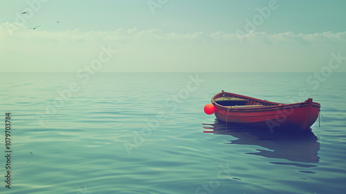 Naklejka premium A Rescue Boat Floating on Calm Waters, With a Life Buoy Attached to Its Side, Ready for Action, Surrounded by a Serene Blue Sea and a Distant Horizon, While Seagulls Fly Overhead in a Tranquil Maritim