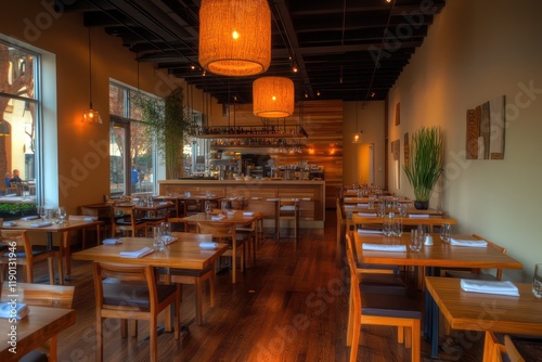 Obraz premium A restaurant with minimalist decor, warm wooden tables, and ambient lighting...