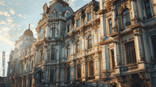Fototapeta premium A restored historical building with detailed architectural elements in a city...