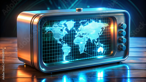 © Faisal, Obraz premium A retro alarm clock displaying digital holograms of future times and dates.