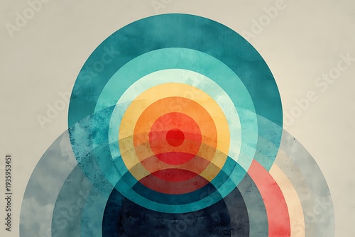Fototapeta premium A retro-inspired abstract design featuring concentric circles in teal, orange, and red with a textured, vintage aesthetic.