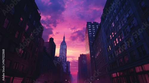 Obraz premium A retro-inspired sundown between New York's towering buildings, with vibrant...