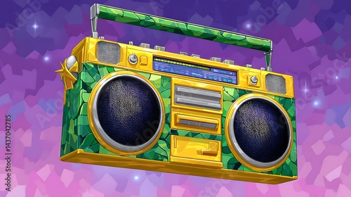 © Biggy, Obraz premium A retro-style boombox with a gold and green design, floating against a starry purple background