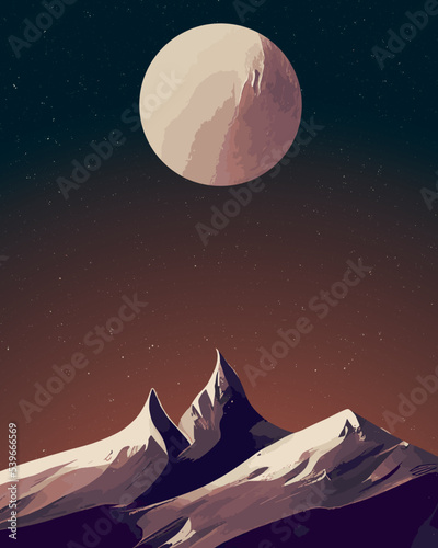 © miketea88, Obraz premium A retro themed space travel poster vector illustration with a large moon and mountains