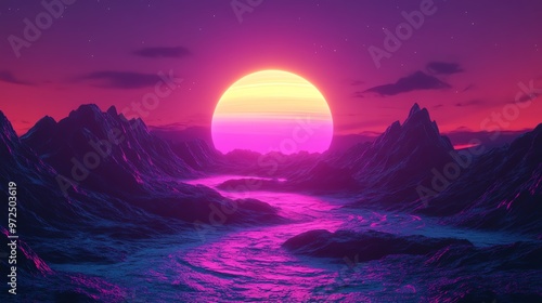 Fototapeta premium A retro, vaporwave-style sunset over a mountain range with a river flowing...