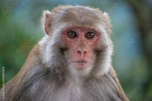 © deepshikha, Naklejka premium A Rhesus Macaque monkey (Macaca mulatta) looks directly at the camera in a close-up portrait, displaying its pinkish-red face and light brown/grey fur framed by a blurred green background.