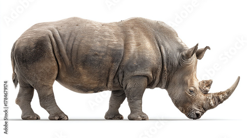 © Sajib, Naklejka premium A rhinoceros standing on a white background with its head lowered to the ground slightly