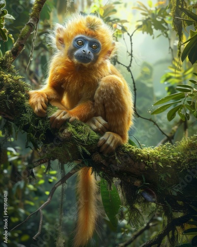 Fototapeta premium a Rhinopithecus monkey sitting on a moss-covered tree branch in a dense forest