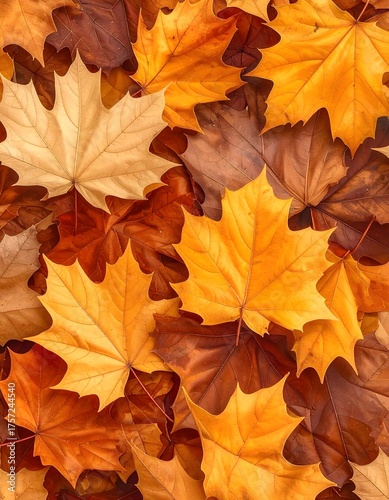 © Firla, Fototapeta premium A rich and vibrant carpet of fallen maple leaves showing the warm, golden hues of the autumn season from a top-down perspective