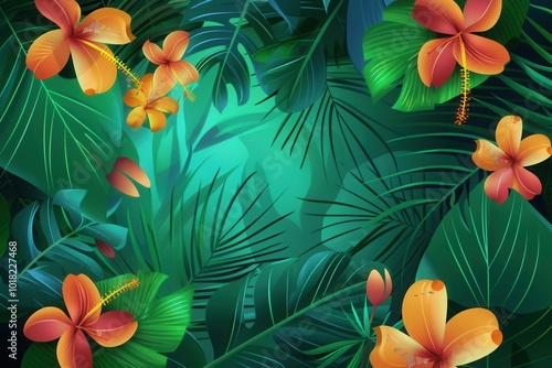 Naklejka premium A rich array of colorful flowers and large leaves evoke a tranquil atmosphere...