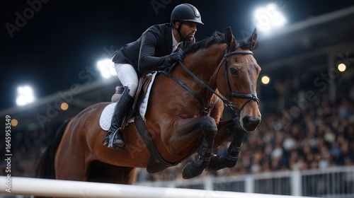 © SerPak, Obraz premium A rider in a black suit jumps over an obstacle on a brown horse during a show jumping event at night, surrounded by an enthusiastic crowd.