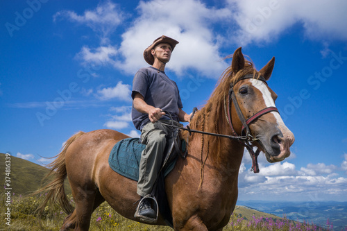 Fototapeta premium A rider in a wide-brimmed cowboy hat on a horse against a blue sky.