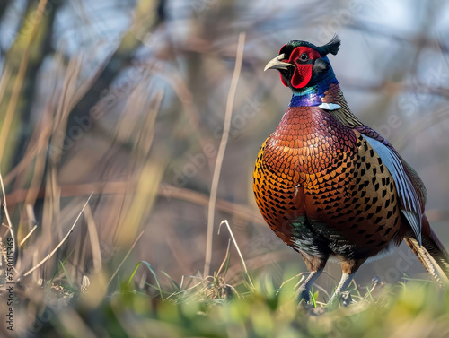 Fototapeta premium A ring-necked pheasant with splendid colourful feathers hidden in the fields.