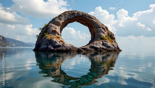 © Kannikar, Fototapeta premium a ring shaped rock formation rising from the water, mirrored below.