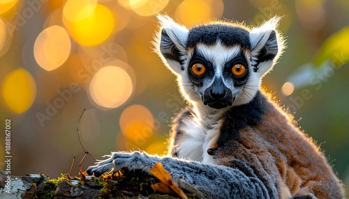 © Jonatan, Fototapeta premium A ring-tailed lemur gazes directly at the camera with large orange eyes in sunlit forest