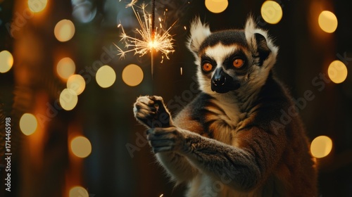 Obraz premium A ring-tailed lemur holds a sparkler in a festive setting with blurred lights...