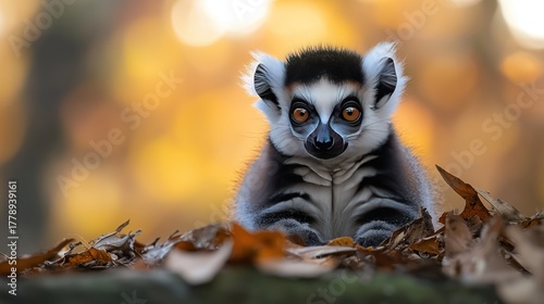 Naklejka premium A Ring-tailed Lemur sits among fallen leaves, autumn-colored background