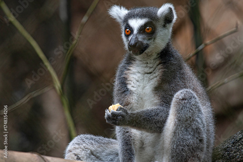 Obraz premium A ring-tailed lemur sits calmly on a branch, holding food in its hand. Its bright orange eyes and soft gray fur stand out against the natural background, capturing Madagascar’s unique wildlife beauty.