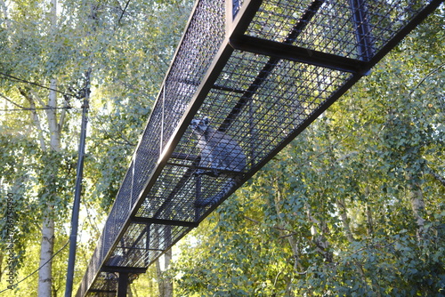 Obraz premium A Ring-tailed Lemur sits on a metal bridge between trees at the zoo.