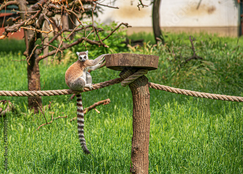Obraz premium A Ring-tailed Lemur sits on a thick rope, reaching for a wooden platform in a grassy