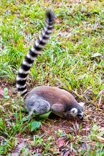 © Natalia, Fototapeta premium A ring-tailed lemur sits on the ground, holding its long striped tail high against a backdrop of grass.