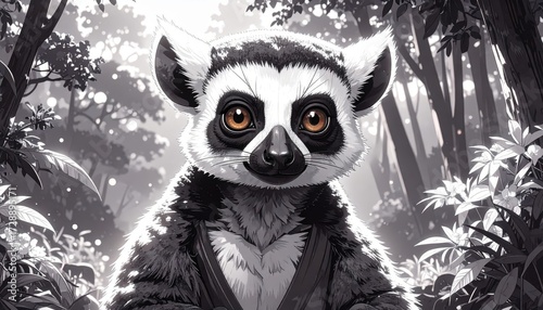 © Zevania, Fototapeta premium A ring-tailed lemur stares ahead in a black and white forest scene, creating a