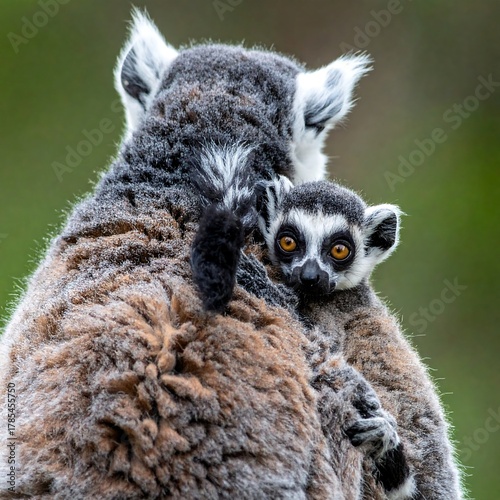 Obraz premium A ring-tailed primate carries its infant on its back, a tender embrace amidst...
