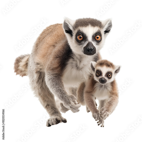 Obraz premium A ringtailed lemur mother with her adorable baby, both looking directly at the camera, captured in a fullbody shot, isolated on transparent background