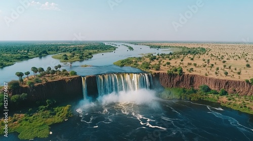 © Artittaya, Fototapeta premium A river flowing over a wide waterfall, creating a curtain of cascading water