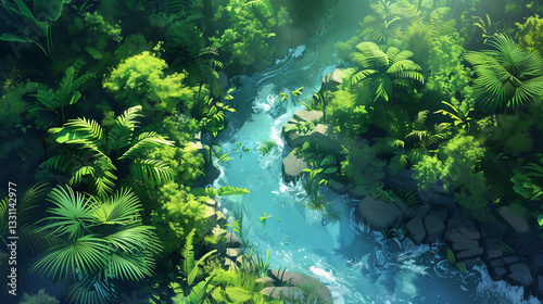 © Ashiq, Fototapeta premium A river flowing through a dense jungle with vibrant greenery