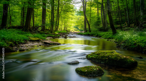© mahamad, Obraz premium A river flowing through a spring forest.
