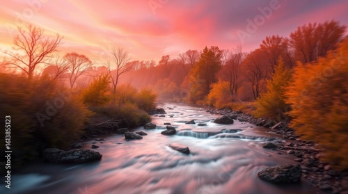 © Novi, Naklejka premium A river flows amid autumn trees under a red and orange sky surrounded by rocks