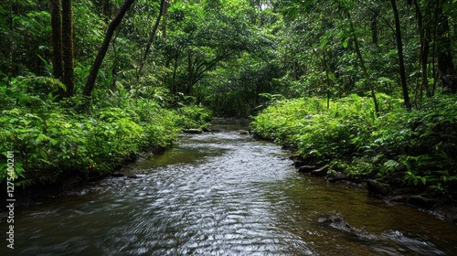 © lestari, Obraz premium A River Flows in a Calm Forest Amid Lush Green Plants and Softly Illuminated by the Sun