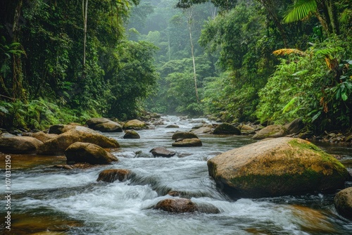 Obraz premium A river flows through a lush green forest, surrounded by rocks