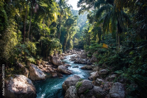 © Albert, Fototapeta premium A River Flows Through a Lush Tropical Forest