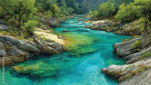 Naklejka premium A river flows through verdant trees and boulders in this painting