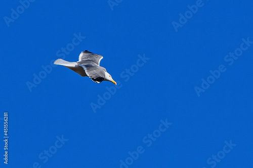 © vladimir subbotin, Obraz premium A river gull flies alone in the blue sky