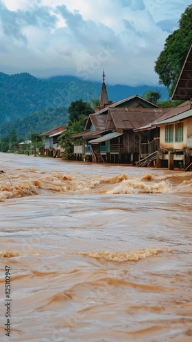 © liliyabatyrova, Obraz premium A river is overflowing and houses are in the water