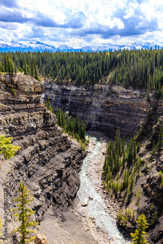 © Scott Prokop, Fototapeta premium A river runs through a canyon with trees on either side