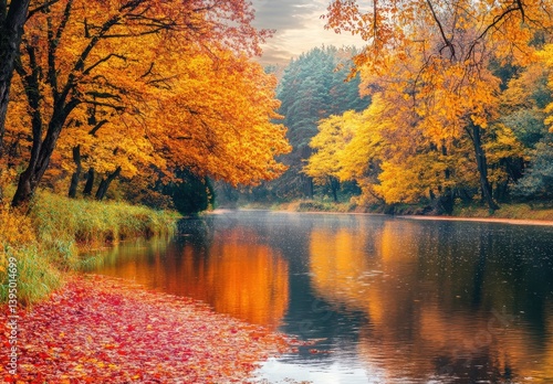 © Alexei, Obraz premium A river surrounded by trees with yellow leaves reflects in the water