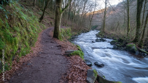 © Albert, Obraz premium A river winds through a verdant forest, surrounded by trees densely layered with leaves and dotted with rocks