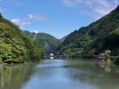 © Masakazu Tokashiki, Fototapeta premium A river with a green forest on either side. The water is calm and clear. The sky is blue with some clouds